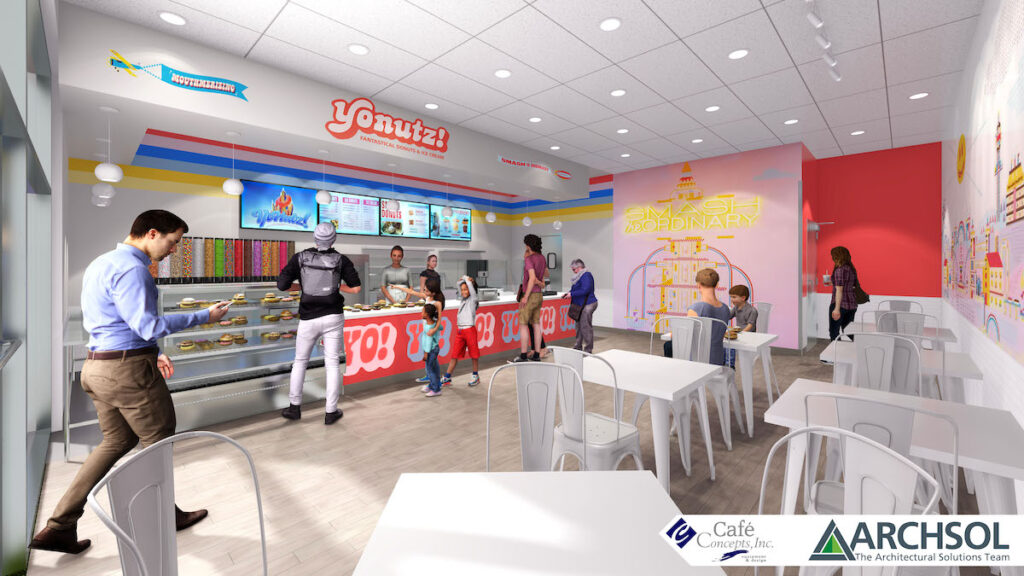 Designed to evoke a sense of delight and playfulness, the interior of Yonutz is a collaboration with Cafe Concepts, Inc that blends vibrant colors, contemporary elements, and whimsical touches to match the delicious treats produced every day within the restaurant. ARCHSOL’s architects carefully considered the flow of customers and created an open-concept space that encourages exploration and interaction. The shop features a central donut display, allowing customers to witness the artistry of freshly made treats and the signature “SMASHED™ station.”