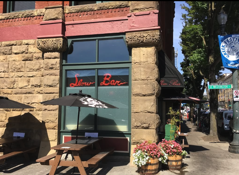 Slow Bar is right next to My Father’s Place Grill at the corner of SE Washington Street and SE Grand Avenue, also close to Hotel Grand Stark. The outdoor seating wraps around the building, and this is expected to stay the same.