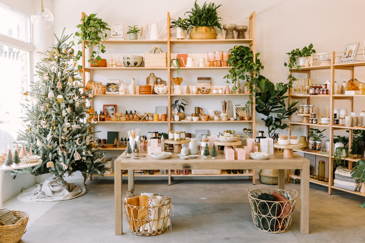 Haven has curated a home and natural wine shop, filled with specialty goods, house wares, gift items, and indoor plants. Behind the retail store, an airy indoor event space features natural wood tables, a lounge, kitchenette and bar.