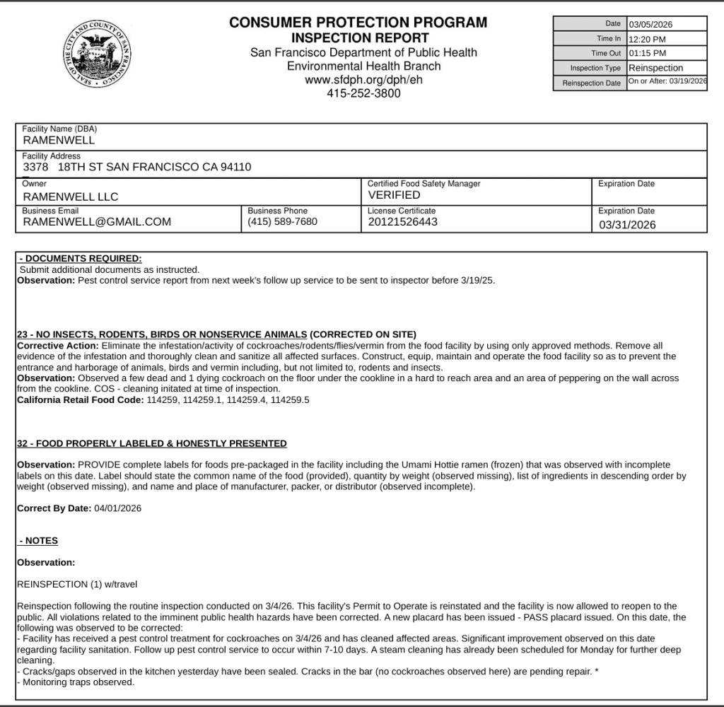 The Ramenwell was temporarily closed after the San Francisco Department of Public Health conducted a routine health inspection on March 4 and flagged the eatery for multiple health code violations. However, the restaurant underwent a reinspection on March 5 and received a pass, allowing it to reopen.
