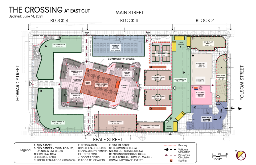 A joint venture between the East Cut Community Benefit District, Street Soccer USA, Real Active and Nestory Park, The Crossing at East Cut promises to offer an assortment of different recreational activities. They’ve already been awarded the rights to move forward with the project, and their proposal includes outdoor Street Soccer fields, pickleball courts, an outdoor cinema, a dog run, a children’s play area, and even a family friendly beer garden.