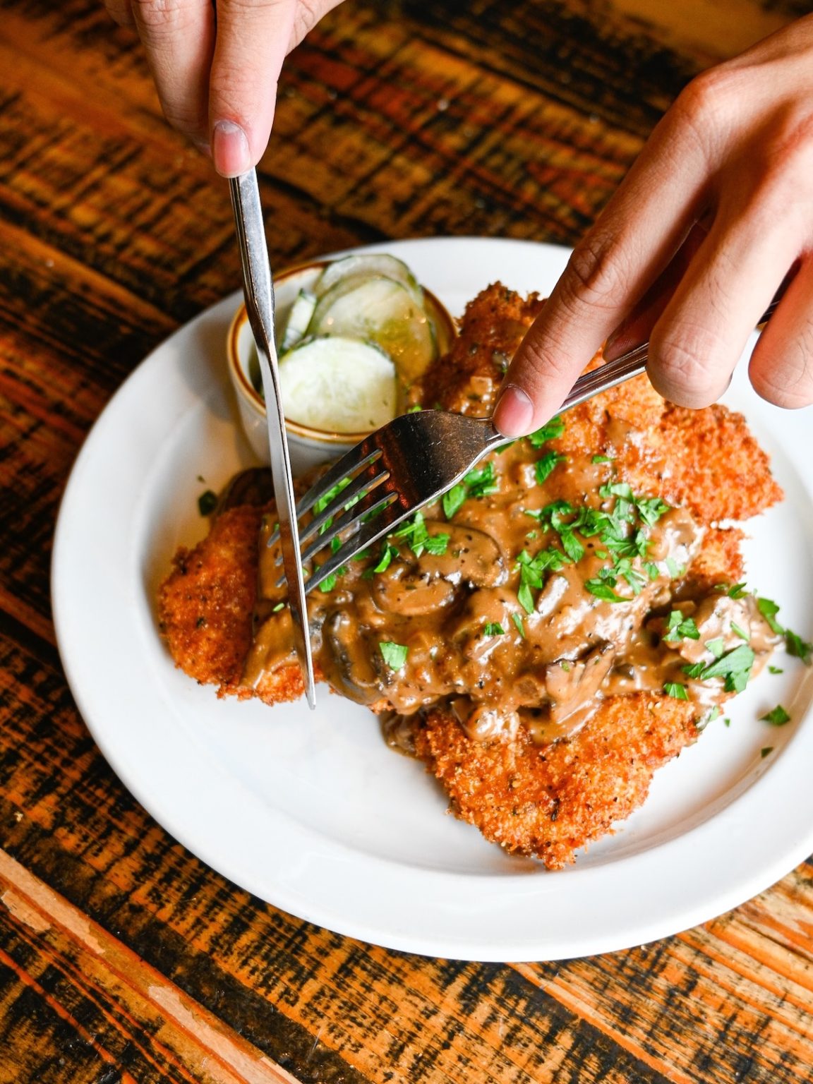 The menu features Mains like the Tavern Pot Roast, Chicken Jager Schnitzel, and Bayou Style Shrimp & Crawfish. There are sandwiches (served with choice of fries or southern slaw) that include Nashville Hot Chicken, Wood-Grilled Chicken, and the Wood-Grilled Fresh Catch. There’s also brunch, with choices like the Ham & Cheese Benedict, Chicken & Waffles, and the Breakfast Smash-wich (house-made buttermilk biscuit, scrambled eggs, two maple sage sausage patties, sharp cheddar, tavern cheese sauce).