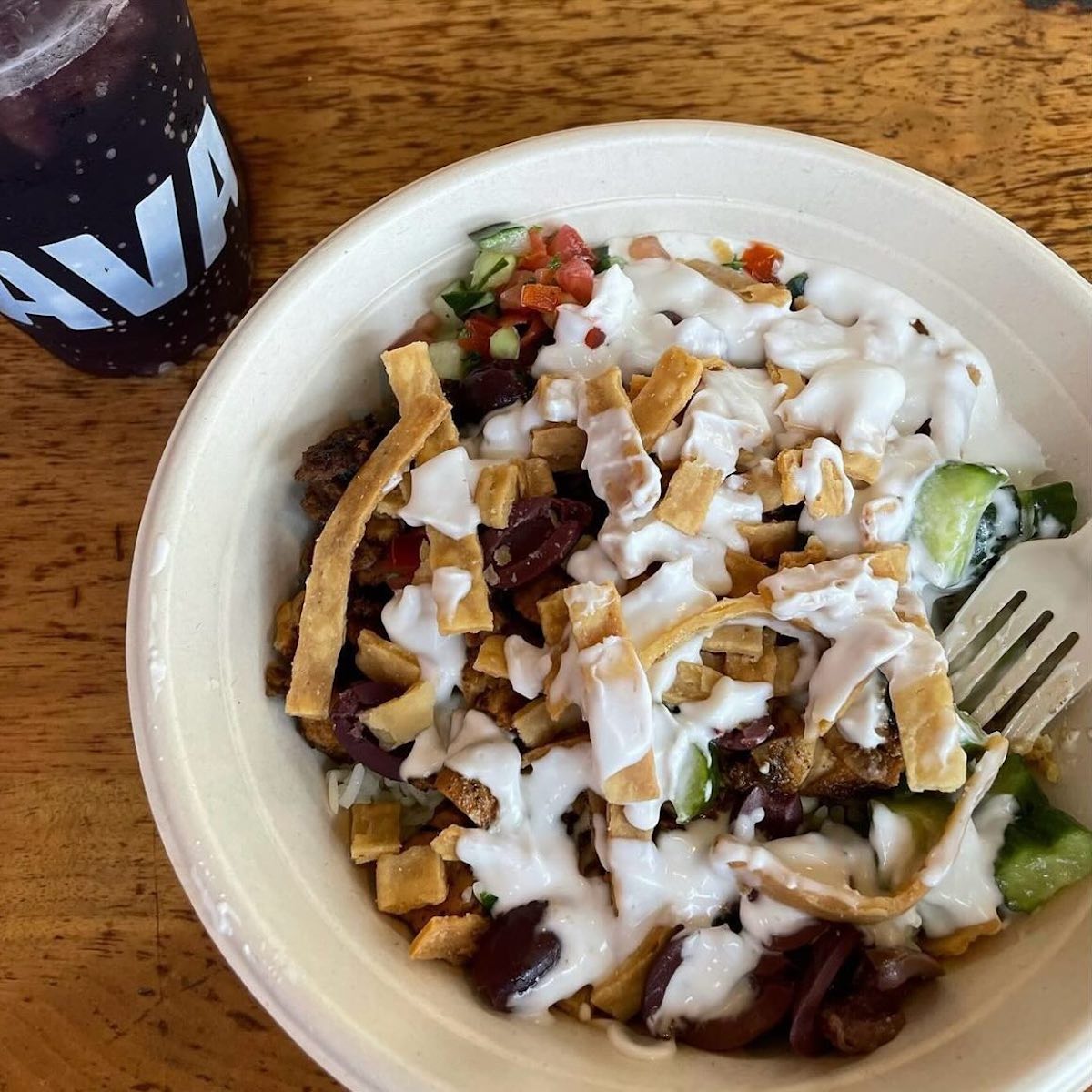 CAVA’s menu of Mediterranean centers bowls and pitas, including the Balsamic Date Chicken bowl (Grilled chicken, eggplant dip, red pepper hummus, corn, brown rice, spinach, balsamic date vinaigrette) and the Lentil Avocado Bowl (Falafel, roasted veg, roasted eggplant, hummus, avocado, lentil, tabbouleh, spinach, SuperGreens, skhug), and pitas that come in varieties like Sweet + Spicy Chicken, Crispy Falafel, and Spicy Lamb Meatball.