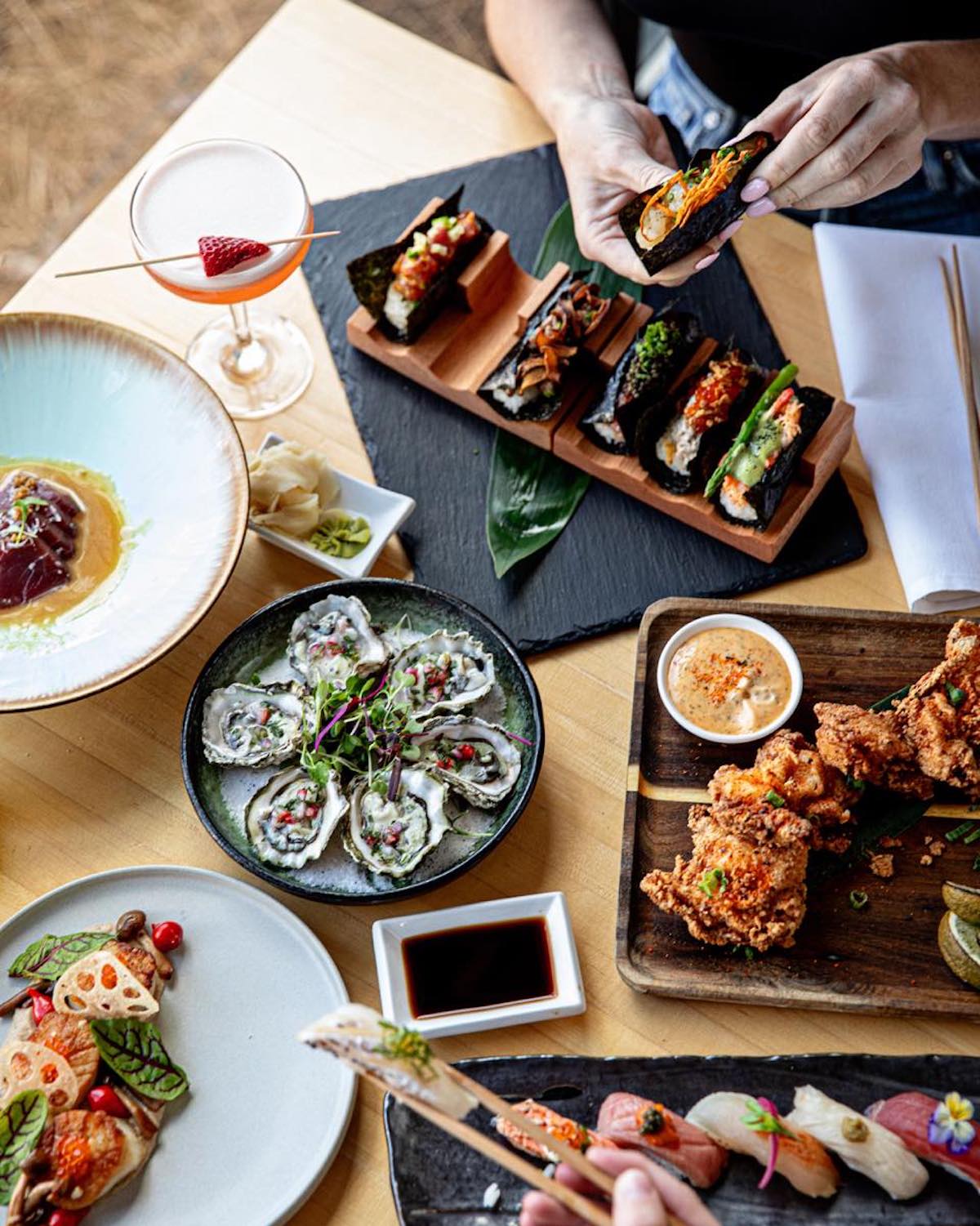 With locations in cities like Atlanta, Charlotte, Nashville, and Jacksonville Beach, “celebrates authentic Asian cuisine with a regional approach through a menu that focuses on unique ingredients and sophisticated presentations. From temaki, nigiri and sashimi to hot plates and signature rolls, O-Ku’s chefs showcase the freshest fish from the world’s finest markets alongside local sustainable sources.”