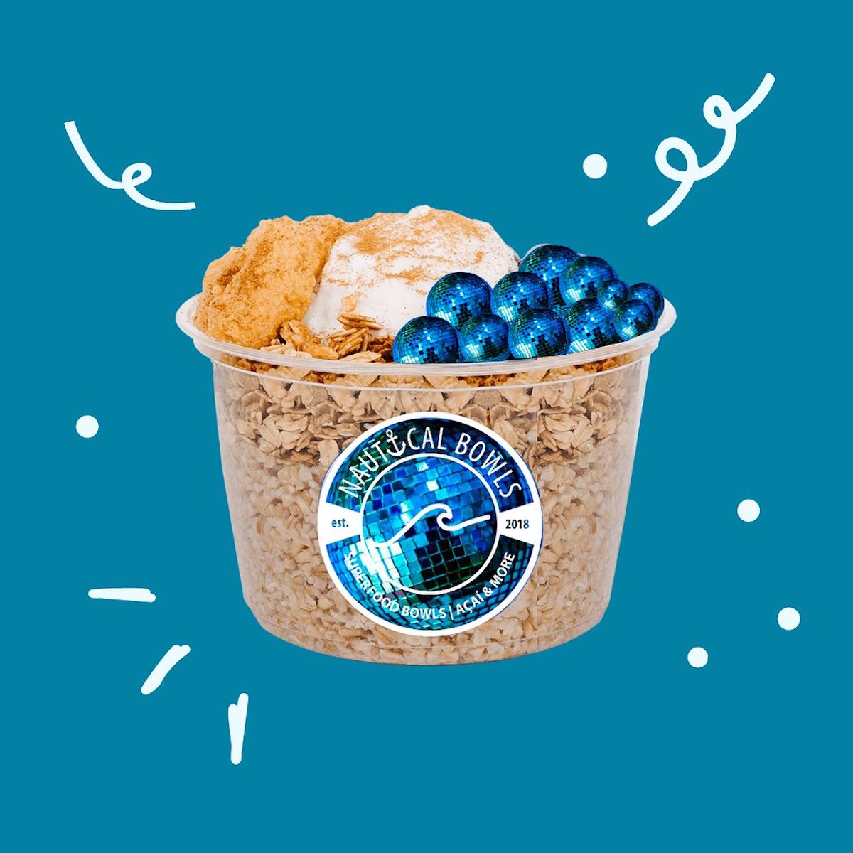 Popular Nautical bowls include the Nauti Bowl (Açaí, Pitaya, Granola, Banana, Cacao Nibs, Peanut Butter), the Big Island Bowl (Blue Majik, Açaí, Pitaya, Mango, Coconut, Vanilla Chia, Granola, Strawberries, Goji Berries, Hemp Seeds), and the Paddle Bowl (Blue Majik, Mango, Coconut, Granola, Strawberries, Coconut Flakes, Honey). You can also build your own bowl, choosing from a range of bases and toppers.