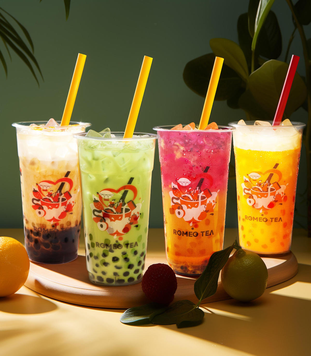 Romeo Tea will launch with a selection of boba-infused fruit teas and milk teas, featuring more than thirty different varieties. The plan is to grow this menu with one new drink each month, eventually reaching a total of more than seventy.